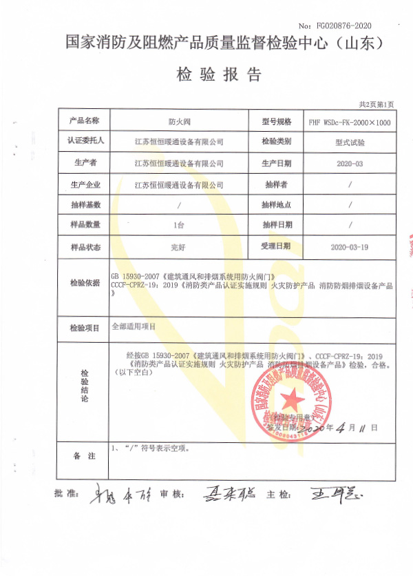 防火閥認證證書2000X1000