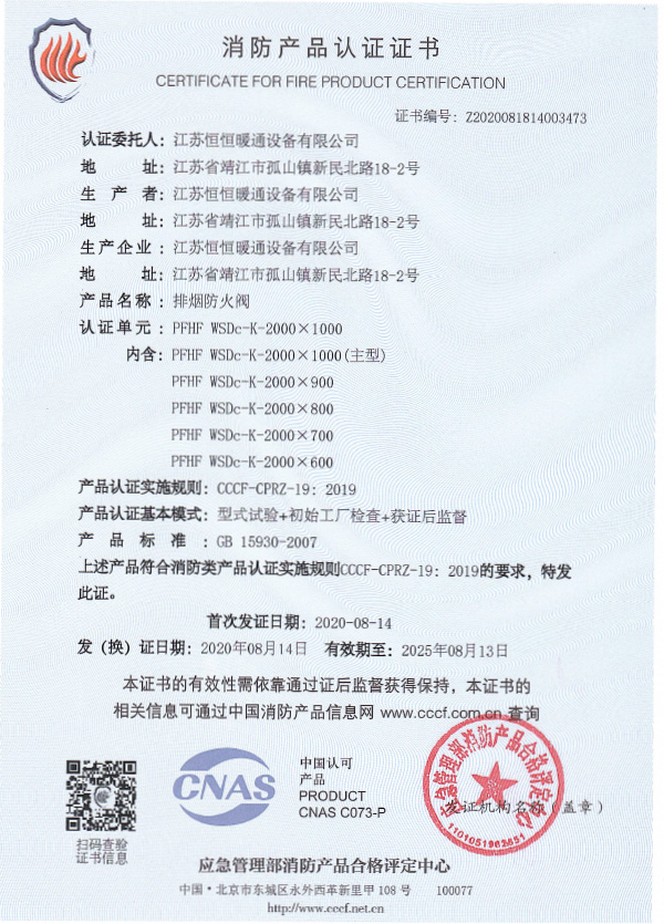排煙防火閥認證證書2000X1000